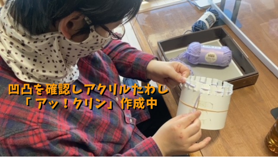 今話題のエコクラフトテープを一本ずつにほどき、それを編んで作ったコースター(約10㎝×10㎝×0.5㎝)。見えない、見えにくい利用者が編み上げました。鮮やかな柄のコースター1枚