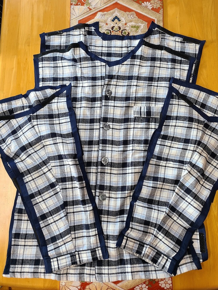 そこで私は理想のパジャマを試作してみたのです。前身頃、後ろ身頃、袖、前脚、後ろ脚をバラバラにして、マジックテープで貼り付けました。