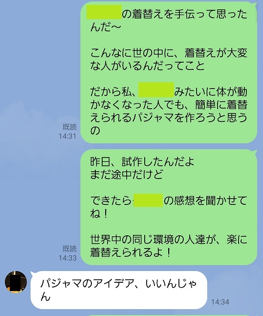 私は障害を持つ子供や介護する大人の双方が、着替えの危険や苦痛を軽減できる機能性を持ったパジャマ、夢をもって、明るい未来を描ける希望のパジャマを作ります。