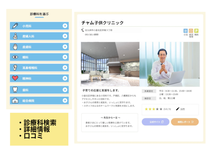 そこでクチコミが充実した病院一覧を作成し、大切な子どもの病院探しをグッと楽にします。
