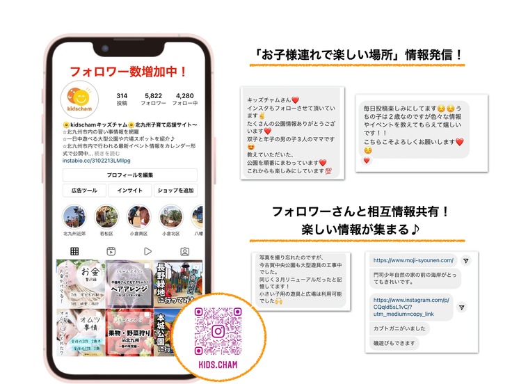 キッズチャムさんのInstagramやHPをいつも拝見させていただいています。子育てで悩んでいる方や、子育て情報が欲しい方、お子様をもっと元気にしたい方は、とりあえず【キッズチャム】を検索してみてください!私たちもキッズチャムさんからの情報から、イベントなどの企画を行い、今ではファンの1人です!現在ではコロナ禍で、お家時間が増えたり、触れ合いの場が減っているように思います。そこで、現役ママ達の想いや、最新の子育て情報はとても貴重です。キッズチャムさんの活動により、1人でも多くの方の繋がりができ、笑顔の輪が拡がることを心より願っています!みなさん親子の元気をつくるために、一緒に応援しましょう!