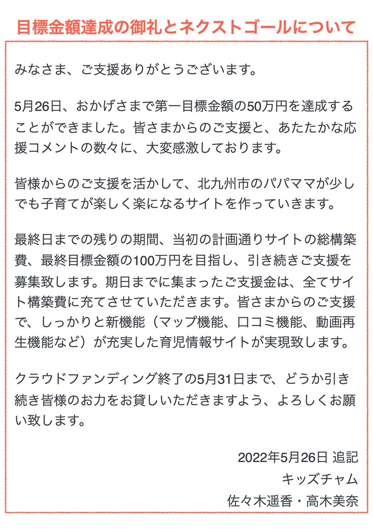 「こんな便利なサイトのある北九州で子育てができてよかった」誰もがそう感じれるような最高の「北九州市に特化した育児ポータルサイト」をみなさんと共に作り上げていきたいです。