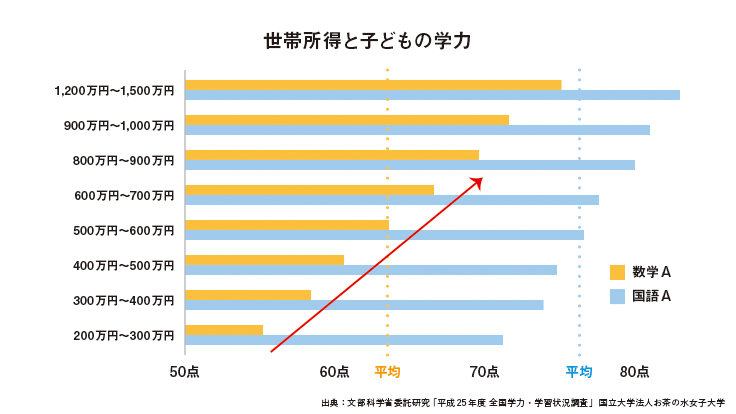 そのため、教育や習い事にお金がかかる日本では、保護者が裕福だと子どもの学力が高く、保護者の収入が低いと子どもの学力も低いという結果が出ており、親の収入によって子どもが将来就ける仕事が決まってしまうと言っても過言ではありません。