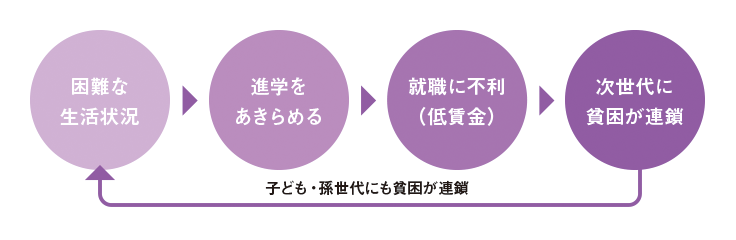 さらに、大学に行きたくても模試や受験料、入学金などが払えなかったり、アルバイトで家計を支えるために進学をあきらめる子どもたちもたくさんいます。そのため、将来的に就ける仕事が限られるために子ども世代にも収入格差が生まれ、次世代にも貧困が連鎖してしまうのです。