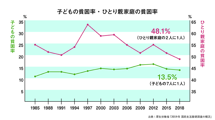 厚生労働省「2019年・国民生活基礎調査の概況」の報告によると、日本の子ども(17歳以下)の貧困率は13.5%で、実に7人に1人の子どもが貧困状態となっています。なかでも深刻なのが「ひとり親世帯の貧困」で、日本のひとり親家庭の貧困率は48.1%と、実に2人に1人のひとり親家庭が貧困状態にあり、OECD加盟国のなかでも最低水準となっています。