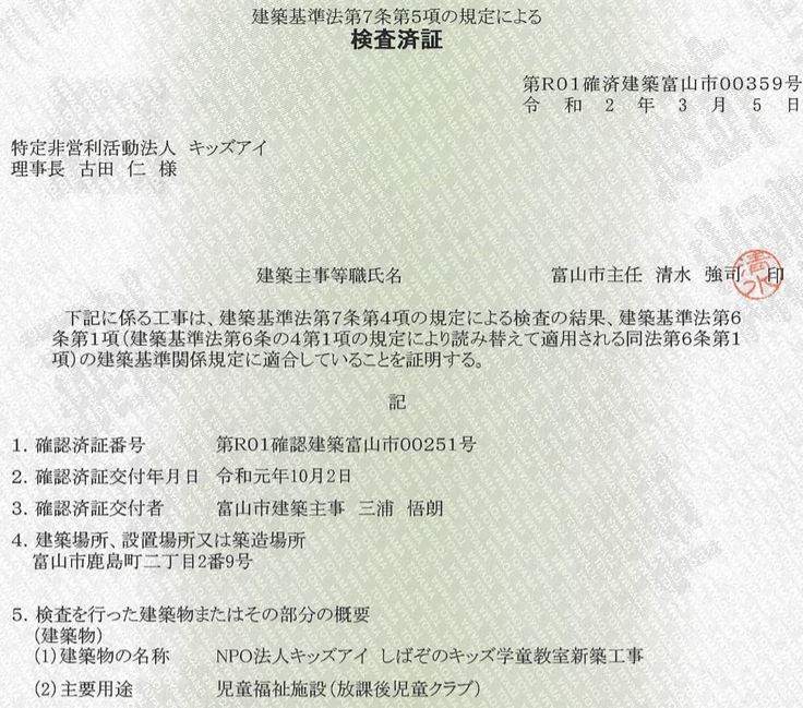 不特定多数の児童が出入りする建物には様々な基準が設定されています。耐震・防火・耐火・防音・採光・通気に加えて、男女別トイレ・衛生設備・避難階段・小学一年生でも昇り降りできる緩やかな段差、防犯機器、警報装置 等々。知識が足りなかったため想定外の費用が発生しましたが、役所から一つ一つ指摘されてみれば、お子さんをお預かりするには不可欠の設備ばかりでした。3月5日に建設会社さん、設計士さん他の多大な協力を得て自治体の検査に合格しました。あとは消防の審査をパスすれば、いよいよ竣工になります。