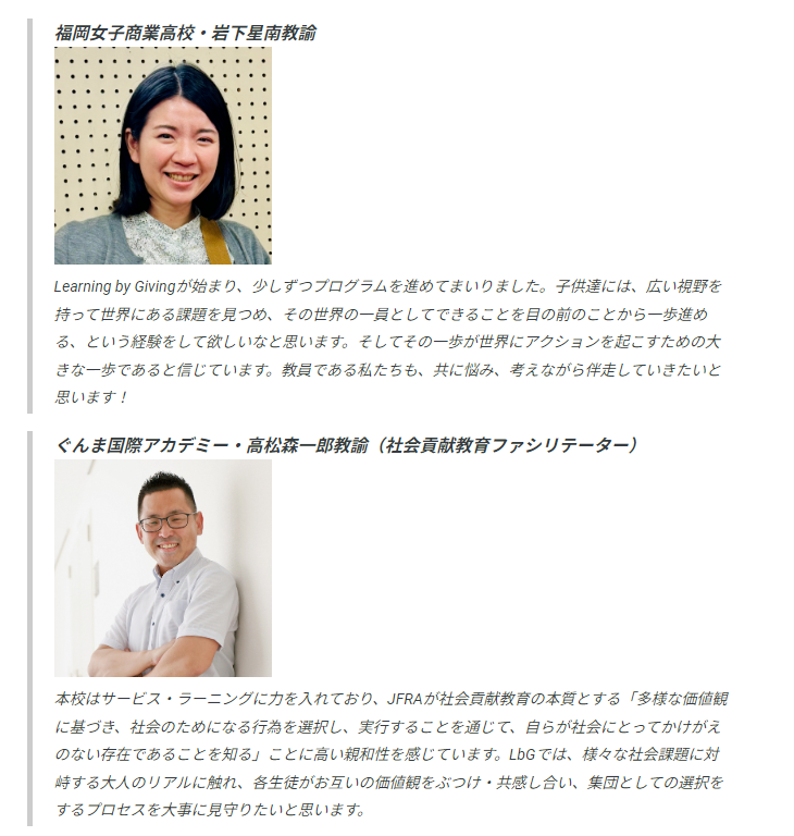 「ファシリテーター」の中でも、学校現場で実際にプログラムを展開されているみなさん(教員・教育コーディネーター)のみなさんが、本アクションに関わるアツい思いをメッセージとして頂いておりますので、ご紹介いたします。