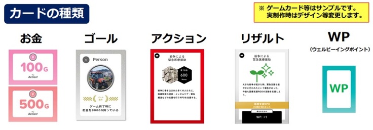 プレイヤーには、始めに「お金」「ゴール」「アクション」の3種類のカードが配布されます。