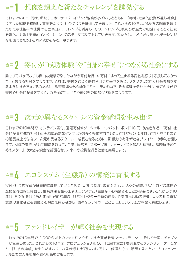 10周年を迎えた2019年には、「2030 VISION」として5つの宣言を掲げました。