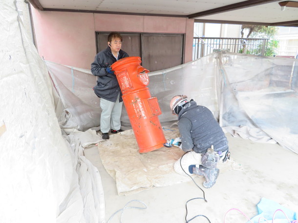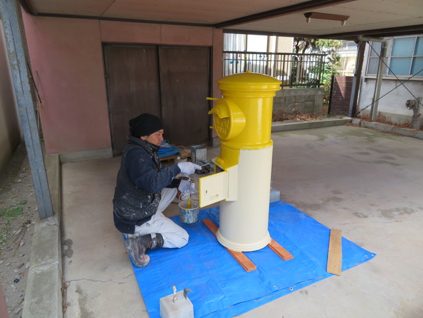ポストの塗装作業はさび落とし作業から始めました。次に、下塗りを兼ねた防錆塗装作業です。設置する女川町では塩分を含む海風が吹き付けるために丁重に塗装をしました。