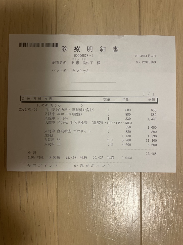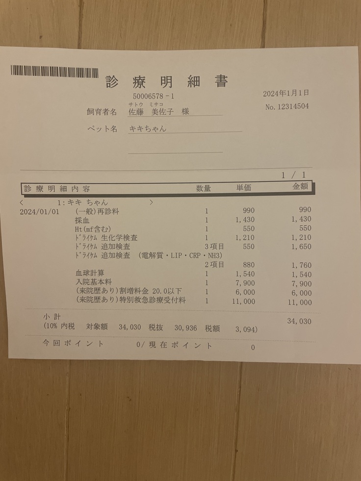 急遽必要な検査費用、入院費は別途必要とのこと(動物病院にて確認済み)