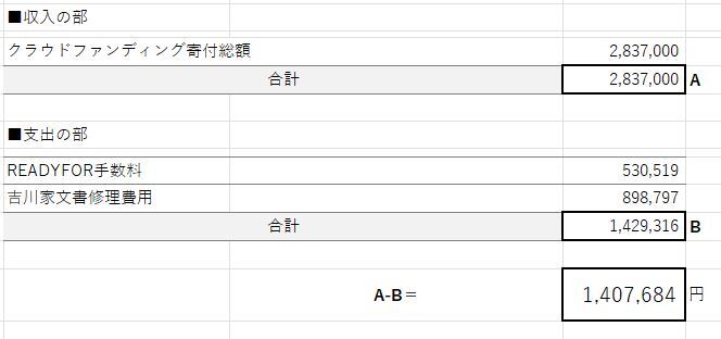 残った費用1,407,684円は「プロジェクト概要と集めた資金の使途」にてご説明しております通り、全て吉川広家公肖像画修理費用3,334,952円(内1,667,000円は岩国市補助)に充当させていただきました。