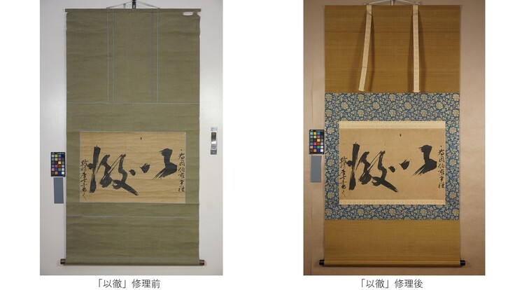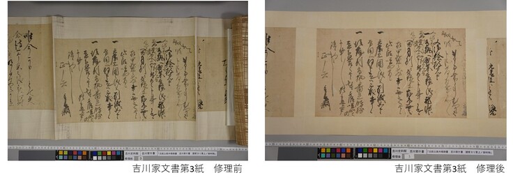 吉川家文書の巻子と元長公の「以徹」掛軸は、随所に折れや糊浮きが見られ、表装も劣化や破損が際立つような状況でした。今回修理は株式会社岡墨光堂様へ依頼し、どちらも本紙の折れや虫損などを修理いただき、表装も新調しました。また、巻子は文書間の幅がほぼ無く、横一列にした際文書の貼り付け位置もバラバラでしたが、文書間の幅をあけ、文書の下部を一列に揃えることで今後展示した際にご覧いただきやすくなりました。