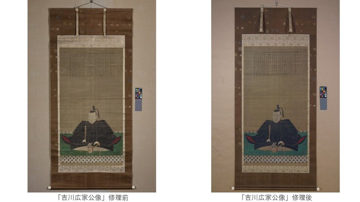 今年、広家公は没後400年を迎えますが、広家公の嫡男広正公が江月宗玩に着賛を依頼していることから亡くなってほどなくして制作されているものと思われます。肖像画は吉川家文書と同じく折れや糊浮、絵の具の剥離などが見られたため修理を行い、表装は元の裂を修理して、当時を彷彿とさせるような大変きれいな状態にしていただきました。