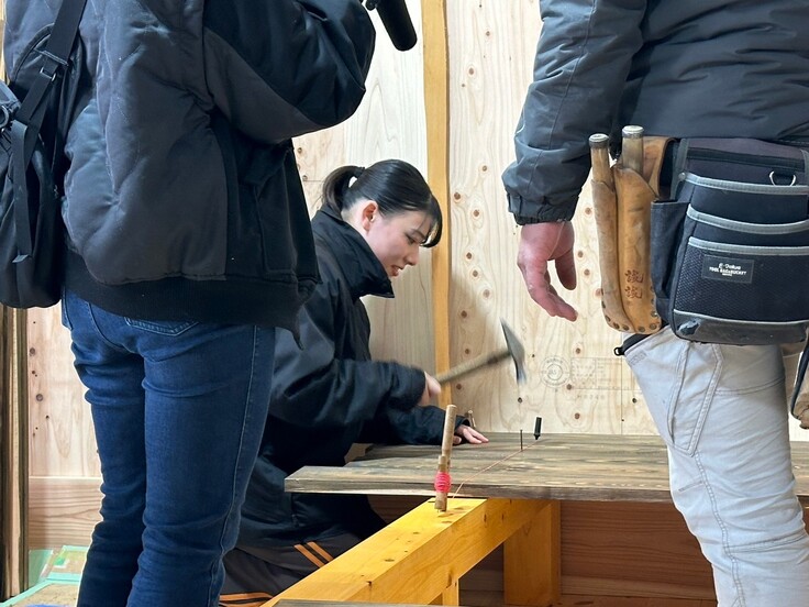 北広島町産の木材を使用したデッキ造りでは木材の特性や切断向きなども学び、長い釘をまっすぐに打ち込むのはかなり技術が必要でした。