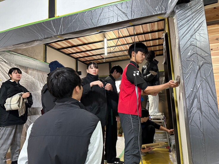 午後からのDIY勉強会では学生さんの実践研修も兼ね、総勢29人が地域住民と一緒に地域の職人の(株)ワダ技建さん、石橋左官さんからDIY技術を学びました。