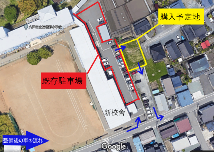 さらには、細長くいびつな形状から、効率よく向かい合って停めることができず、満車時には切り返しや転回も困難なため歩行者にも危険が及びます。保護者、教職員からも児童の安全を危惧する声が多数寄せられています。
