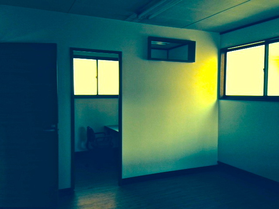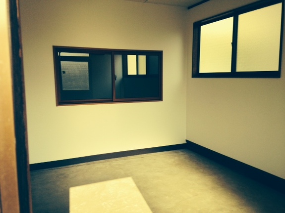 正面、ガラス窓の向うには床を自分たちで貼った8畳の広さの事務所、その奥が、
