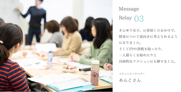 お金の勉強だけでなく、自分の将来の夢を考えるワークや、見た目を素敵にするイベントなど、女子ならではの会も充実していて、仕事以外での人とのつながりができるのが楽しかったです。