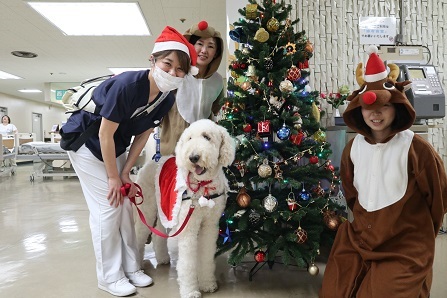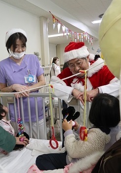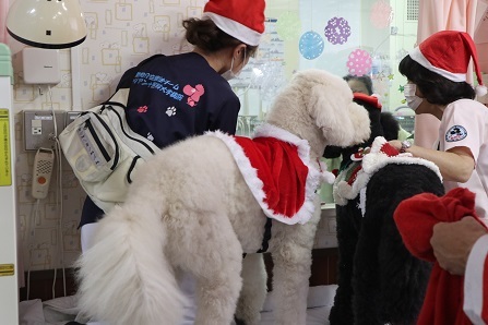 聖マリアンナ医科大学病院の北川病院長がサンタになってくださり、勤務犬運営部会長兼救命救急センター長の平先生や、勤務犬ハンドラー、ミカ、モリスと共に小児病棟をまわり子ども達へクリスマスプレゼントとして届けられました。