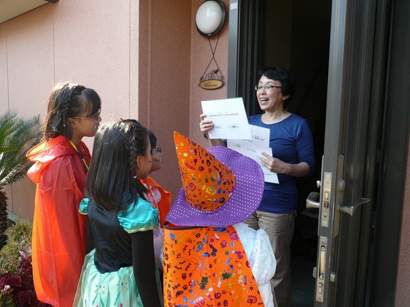 いつもとは違う格好で町を練り歩き、全く知らないお家を訪問するチャレンジ!ただお菓子をもらうのではなく、あらかじめ用意していたクイズに答えてもらうことで、地元の方々との会話につなげました。