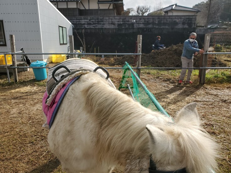 2月7日 オットーとアーニーへお披露目です。蹄洗場ができていく過程を見てきたので大きな抵抗もなく、しっかりと見せることで中に入ることができました。