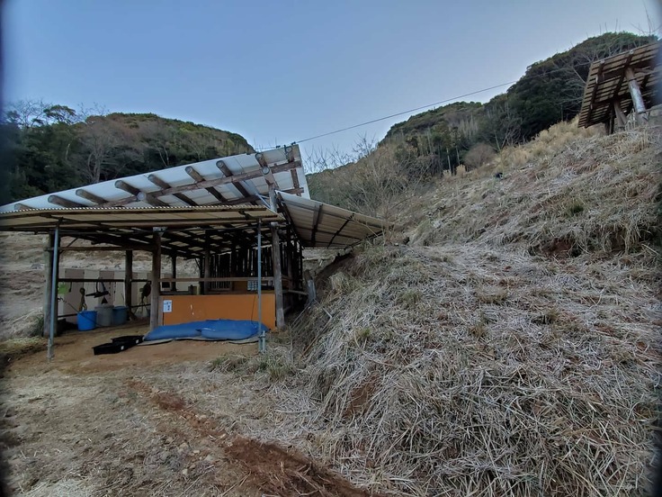 倉庫と馬場の間が予定地。ここにできると動線がスムーズ。蹄洗場にいるときに後ろが気にならないし、周りの様子も確認できて馬も落ち着けると思いここに決めました。