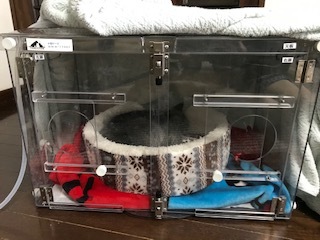 また、当日の血液検査では12月24日の検査結果よりも検査値が悪化しており、貧血も更に進んでいたため(Hb4.5⇒4.3)、院長先生からは輸血か酸素吸入ゲージのいずれかが必要だと言われました。輸血するにはマッチングなどもあり2-3日の入院が必要だと言われました。入院による環境変化が病状を悪化させることを恐れたため、酸素吸入ゲージをレンタルで借りることにしました。呼吸が速いので心臓への負担がないか心配でした。これで少しでも呼吸が楽になるといいね。