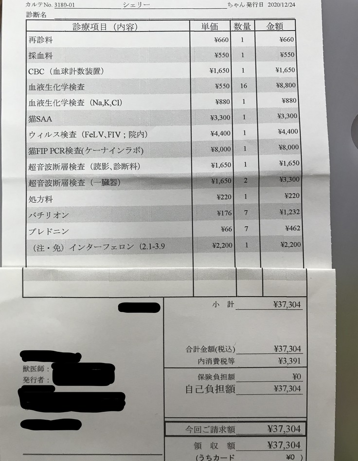 そのほか、酸素ゲージレンタル費用が2か月で60,000円(設置代/撤去代込み)、FIPの診断までに通院検査費がおよそ60,000円ほどかかっております。