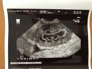 12月24日のクリスマスイブに再受診したところ、腹部エコーで臓器の周辺の異常(臓器周囲の炎症:写真)腹水貯留が認められ、また、肝機能障害と黄疸、高度な貧血(Hb4.5)、体温41度、などからFIP(猫伝染性腹膜炎)の可能性が高いとのことでした。また確定診断のための血液検体でPCR検査をしました。(その後、12月29日に陽性と判明しました)