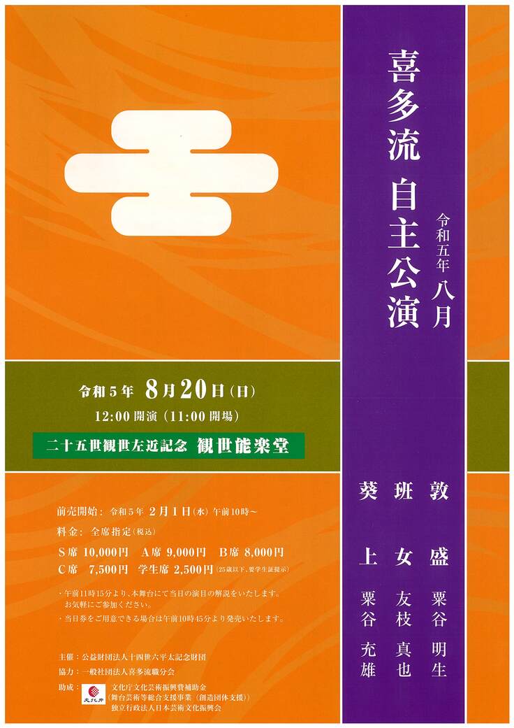 8月20日(日)「喜多流 8月自主公演」を観世能楽堂にて開催いたします。