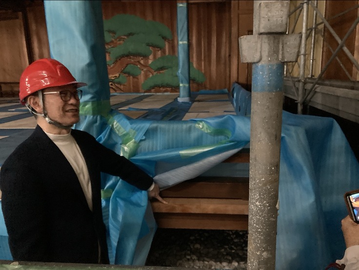 喜多流能楽師、現場監督、設計担当、財団スタッフとともに、能舞台から2階のロビーまで、工事の様子をご見学いただきながら、明治26年に喜多舞台が飯田町に建設されたことから始まる喜多能楽堂の歴史、鏡板を揮毫いただいた江崎孝坪画伯(前田青邨画伯監修)の逸話などもお話しいたしました。
