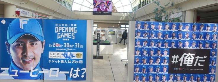 新庄BIGBOSSの「ニューヒーローは?」の問いに「#俺だ」と選手66人が答えるパネルやユニフォーム、ボールパーク内各施設の完成予想図、市民が撮った建設過程の写真展も。3月23日終了です。