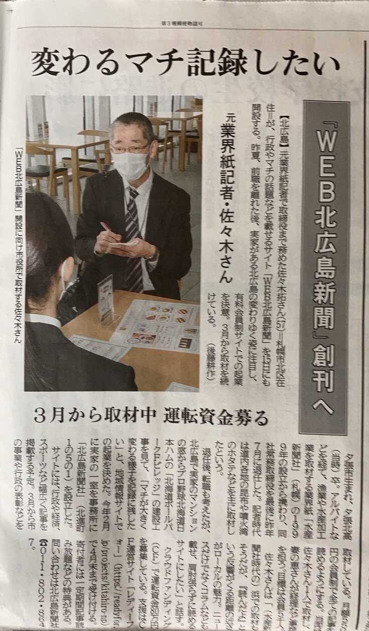 4月9日付「北海道新聞」朝刊北広島版に掲載していただきました。朝、記事を読んだ市民の方からお電話をいただいたり、新たなご支援をいただいたりして身が引き締まる思いです。いよいよ公開目前です。今後ともよろしくお願いいたします。