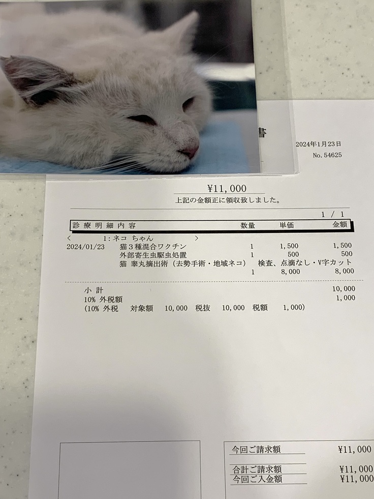 今回の病院への支払い金額はいつもより少し安いのですが、これは前回こちらの病院さんに罹った際(ごじゃりんちゃんのTNR)にお会計の手違いがあって多くお支払いしてしまったため、今回の請求から差額を差し引いていただいたためです。