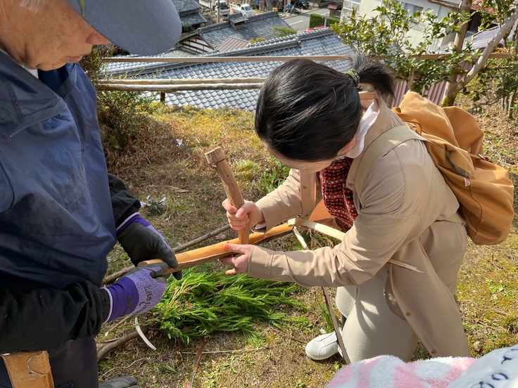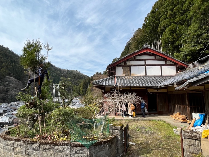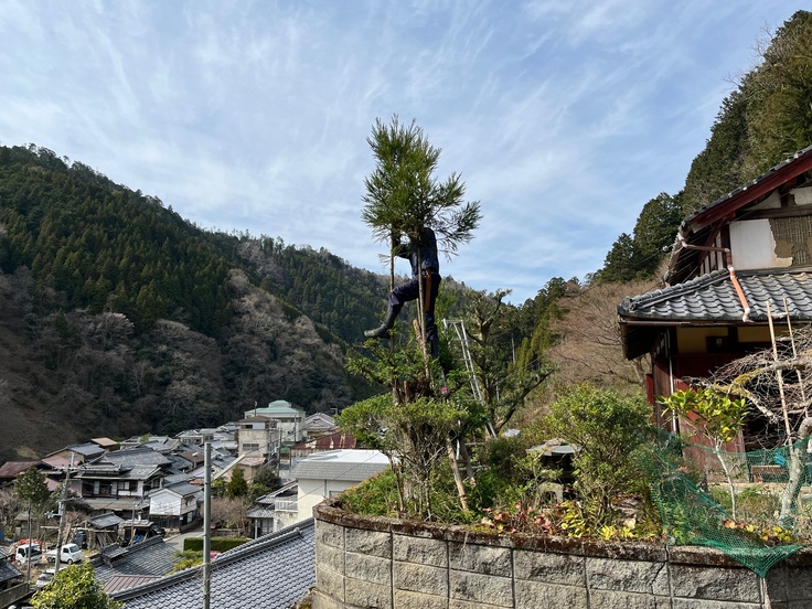 また、中川地区の家の前庭に植わっている北山台杉がモサモサだったので、地元の枝打ち職人さんが枝打ちをしてくださいました(冒頭の写真)。