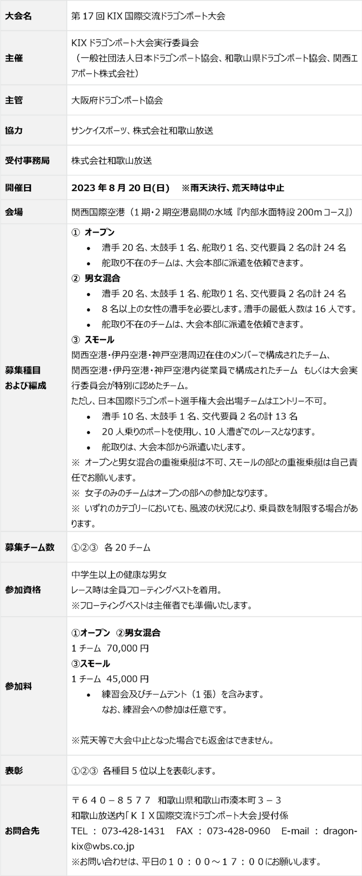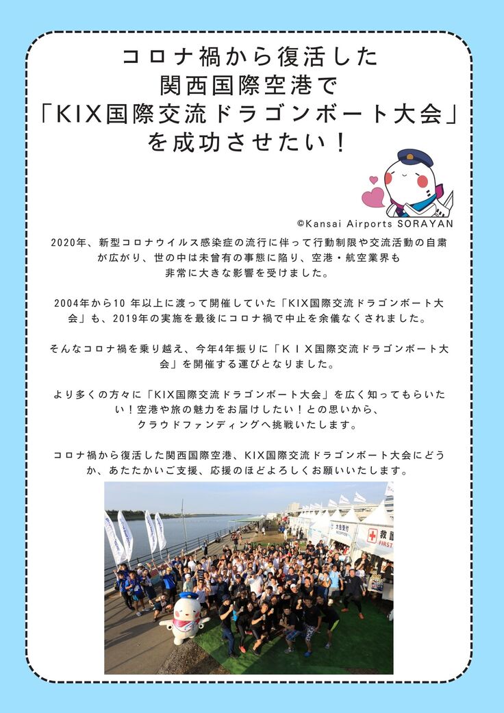 KIXドラゴンボート大会実行委員会が2023年8月20日(日)に第17回KIX国際交流ドラゴンボート大会を実施いたします。皆さまからいただいたご支援金は、開催運営資金全体の一部に使わせていただきます。