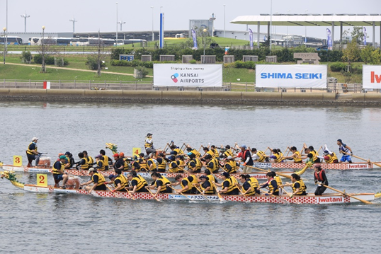 2012年より「KIX国際交流ドラゴンボート大会」と改称し、自然豊かな親水緑地や飛び交う飛行機を背景に、航空会社などの職場チーム、各地で活躍するドラゴンボートクラブチームが出場する国内最大級の大会となっています。( ※過去出場国:香港、マカオ、シンガポール、マレーシア、オーストラリア、オランダ )