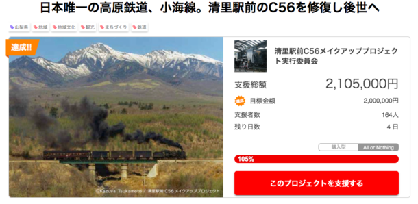 皆様と「JR小海線を皆様と共に未来へつなぐ」「地域を支えた八ヶ岳高原のアイドルC56 を後世に」の思いを分かち合い、目標金額に達することができました。