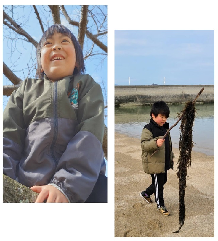木に登るSくんと、拾った藻をかかげて歩くHくん。