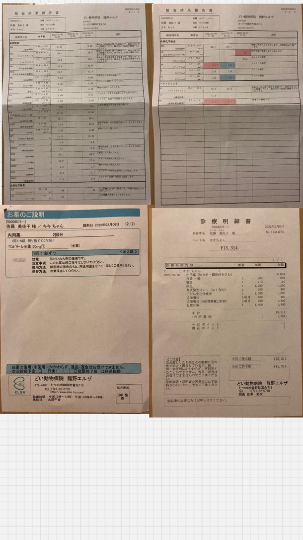 血液検査結果は以前電解水の数値が低かったが今回はそこまで低くない。腎臓や膵臓の数値は正常値とのことでした。