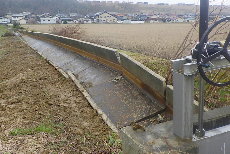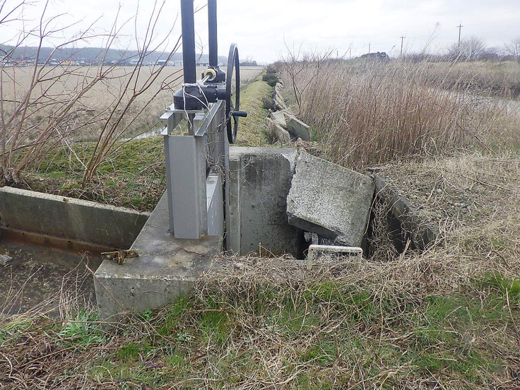【液状化被害によって使用不可能な水路。】河北潟全域で大きく地盤がうねり、田んぼ作業が不可能な状態になりました。