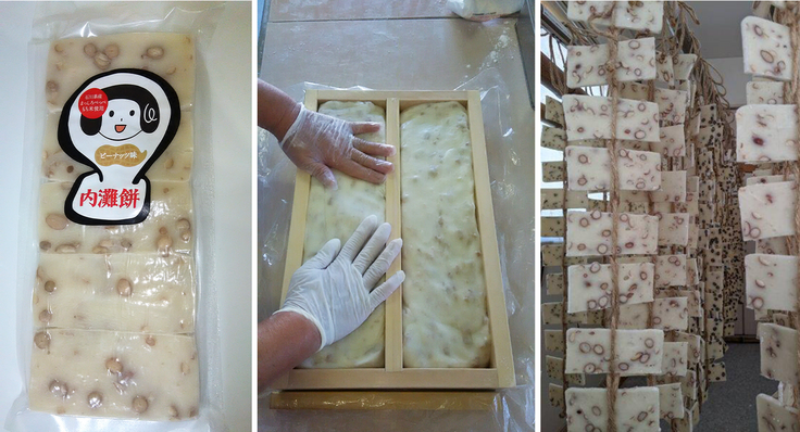 内灘産の落花生と、もち米で作ったピーナッツ餅。ピーナッツの歯ごたえと、ほのかな甘みが子どもたちに大人気です。