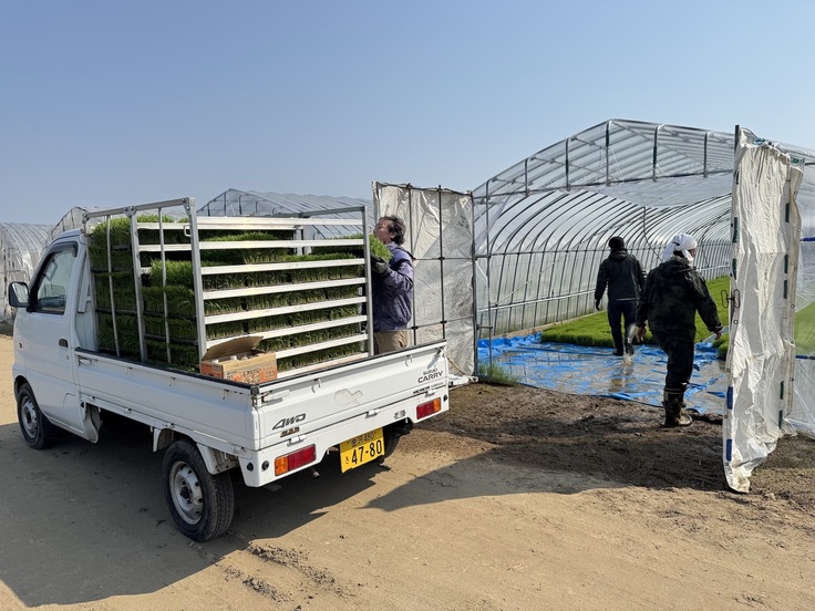 4月29日、いよいよ田植え作業を開始しようと、朝9時からボランティアの皆さんとともに準備を整えておりました。ハウス栽培で順調に育った稲を積み込み、「さあ、これから田植えだ!」と意気込んでいたのですが、水田に入った直後、田植え機が故障してしまいました。