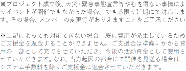 - 必要額と目標額との差額は、協賛金ほか自己資金にて充当します。不足する場合は規模を縮小するなどで対応し、万が一開催困難と判断した場合はプロジェクト実行を見送り、READYFORシステム手数料を除くご支援金のみ返金させていただきます。