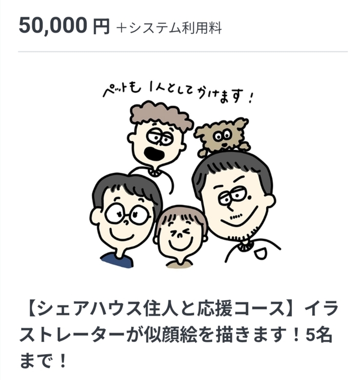 すでにおひとり様での似顔絵リターンでご支援いただいた場合でも、3人、5人への変更が可能です!【全力応援コース】での口数調整により、不足金額分を追加ご支援いただくことで変更できます。気になることがあればどうぞご気軽にご連絡ください!