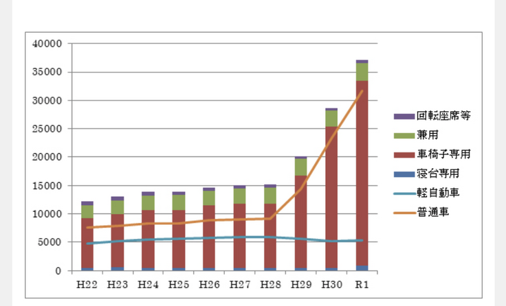 介護タクシーの必要性として、平成29年以降2〜3倍の介護タクシー数が増加しております。