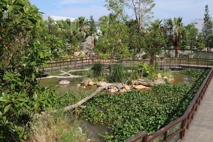 植物が生い茂った展示場ではアメンボやトンボなど様々な虫が集まりビオトープのような場所になっています。