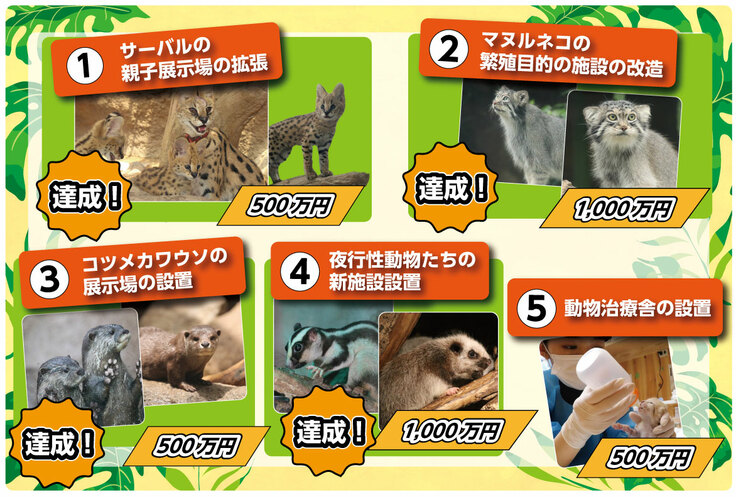 3000万円達成ということで、実現したいことは4つ目の「夜行性動物たちの新施設設置」まで達成しました!