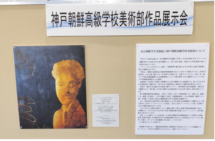 美術部の作品と並んで、兵庫県の6つの朝鮮学校を説明するパネルや朝高生の作文が取り上げられた新聞記事なども展示され、朝鮮学校が置かれている厳しい現実についても垂水区民に知っていただく機会になったと思います。
